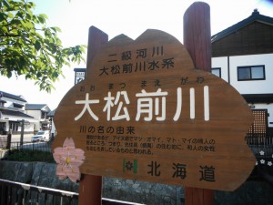 川看板の旅 大松前川 -オオマツマエガワ- Oomatsumae river 2014年6月27日 北海道の魅力をつたえ隊 区分:2級河川 由来:婦人の居るところ、つまり、先住民(蝦夷)の住む地に、和人の女性も住むを表しているものと思われる。 水系番号:8223 河川番号:10 流域面積:6.5k㎡ (山地:6.1k㎡、平地:0.4k㎡) 流路延長:6.5km