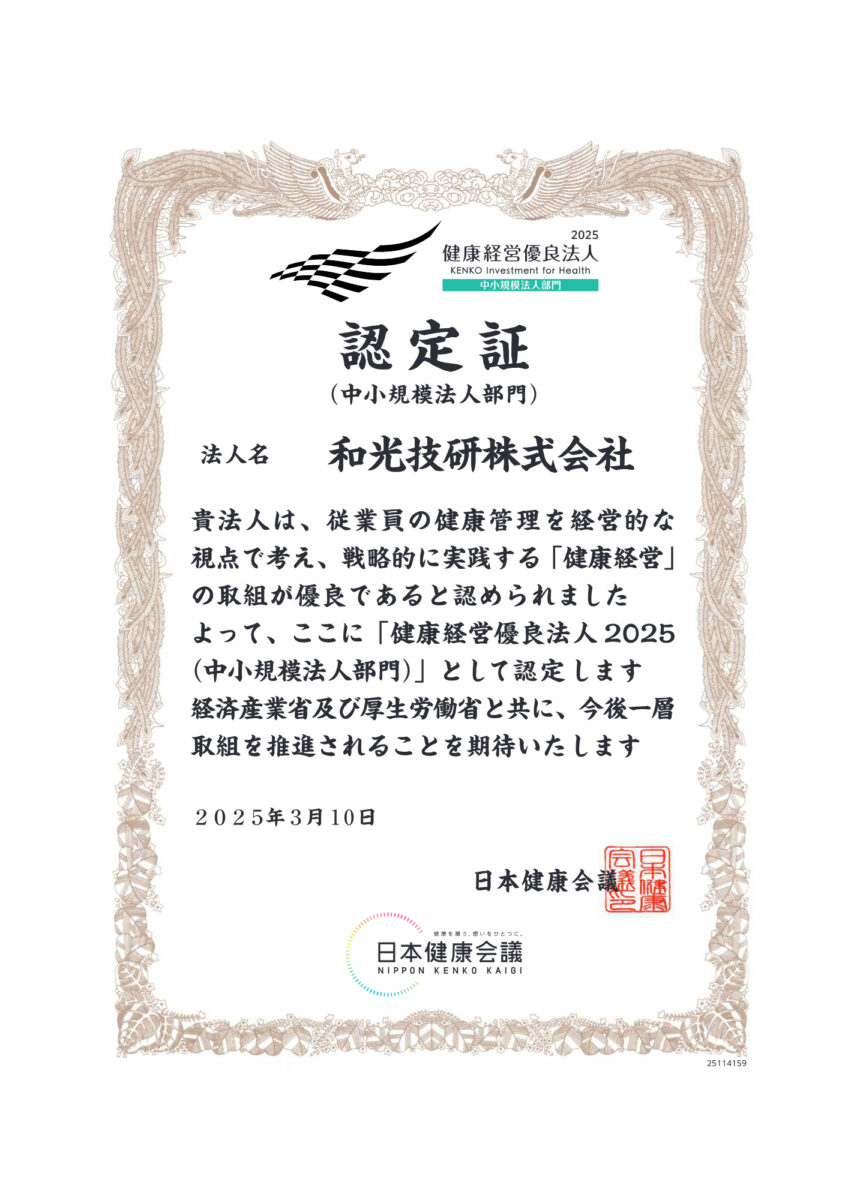 お知らせ 健康経営優良法人2025に認定されました 2025年3月17日 和光HP編集局 3月10日、日本健康会議より「健康経営優良法人2025」に認定されました。 健康経営優良法人制度とは、健康経営推進検討会において定められた評価基準に基づき、特に優良な健康経営を実践している法人を日本健康会議が認定する制度です。
